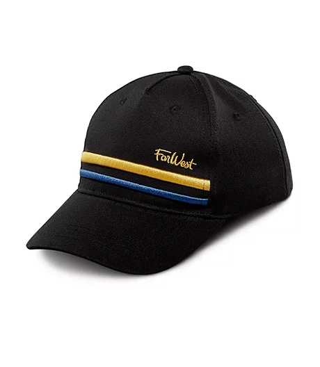 A classic ball cap design from FarWest, this one has the familiar brand mark label on the crown and the rear tab. A pair of prominent coloured stripes highlight the design which features a precurved visor and an adjustable strap to give him a comfortable fit.