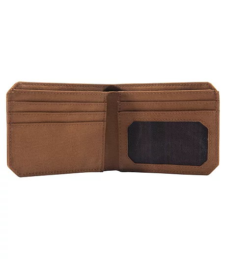 Made of tough nylon duck, this Carhartt Bifold wallet has a PU coating and a water-resistant finish. It has a bill divider and five card pockets. RFID technology protects the contents from information thieves.