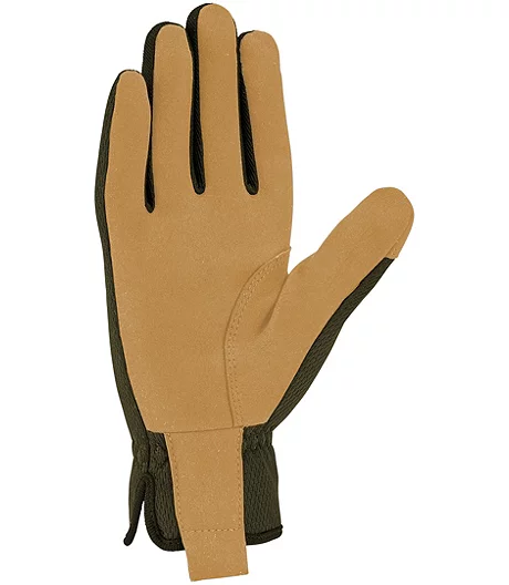 A general purpose work glove from Carhartt, this pair is made from breathable mesh with synthetic suede palms. Thumb saddles are reinforced for durability.