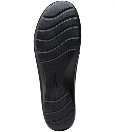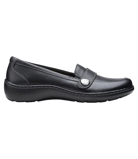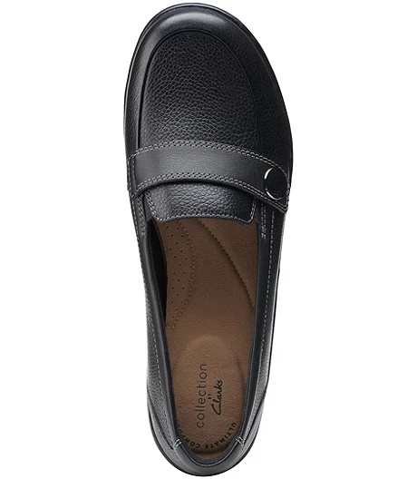 From Clarks, these loafers have full grain leather uppers and decorative strap details. Elastic gussets make it easy to slip them on and provide a good fit. Comfort features include long-lasting Ortholite® insoles that reduce impact and wick away moisture, making the shoes perfect for barefoot wear.