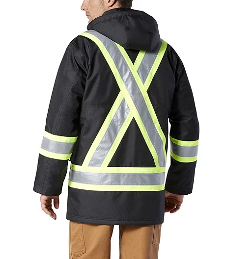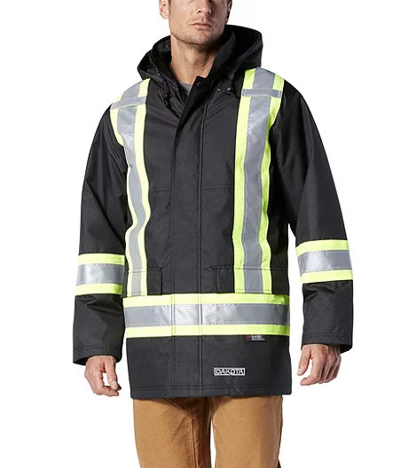 This tough Dakota work jacket is made of PU-coated Oxford polyester for water-repellence. It’s fully lined and insulated for extra warmth when Fall weather takes a turn for the worse, and it has an insulated detachable hood with an adjustable drawcord. You’ll enjoy the extra protection provided with rib-knit storm cuffs and a double front placket with hidden two-way, heavy-duty zipper. This jacket is fully loaded with Velcro-close and zippered pockets to safeguard all your small essentials. Wide and prominent hi-vis and reflective banding keep you safe in low-light environments.