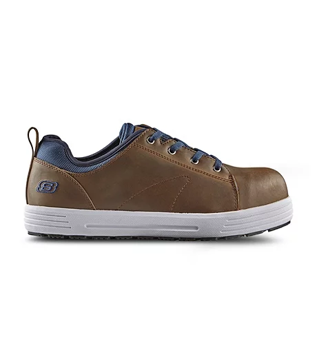 A skate-style safety shoe from Skechers Work, these feature steel toes and steel plates. They are also resistant to puncture and electric shock. The leather design with contrast details is built for comfort with cushioned midsoles and Air Cooled Memory Foam insoles. Slip-resistant rubber outsoles add traction in areas that are prone to moisture and grease.