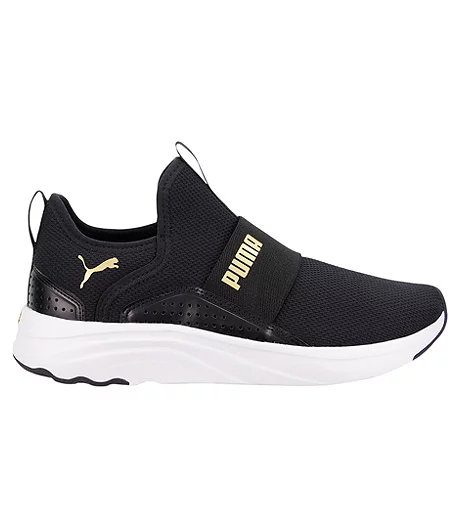 The Softride Sophia Slip-On sneaker utilizes Puma’s plush and comfortable Softride foam and Softfoam+ footbed, ensuring all-round comfort. The upper features a true slip-on construction highlighted by gore and molding details. This shoe showcases Puma’s bold cat branding. The tooling is stacked at a mini-platform level giving it a true femme fashion point of view, without sacrificing comfort. The outsole is designed with light training movements in mind with zoned rubber outsole pods.