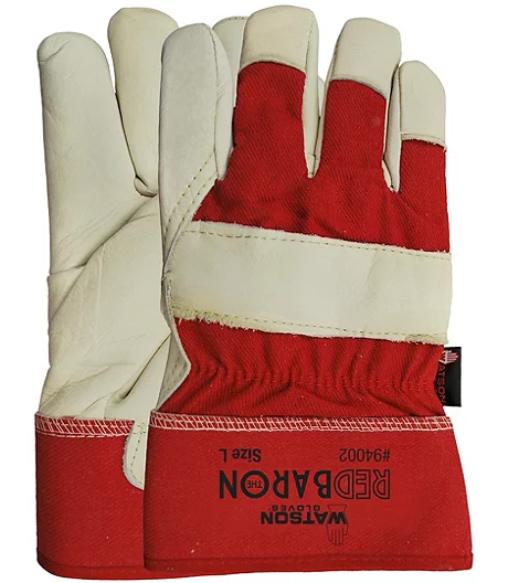 The Watson Red Baron work gloves are made of tough leather and cotton drill for durability. The leather index finger, hooded finger tips and knuckle bar provide added protection and reinforcement. These gloves have snug-fitting wrist elastic and easy-on safety cuffs.