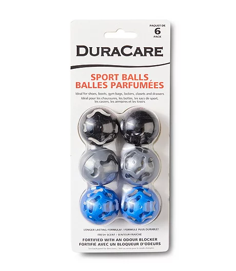 From DuraCare, these balls will keep your shoes, gym bags, lockers, closets and drawers smelling fresh and clean. Treated to destroy odour, they have a fresh scent that lasts and lasts. There are six balls to a pack so you can spread them around wherever you need to turn smelly into sweet.