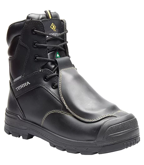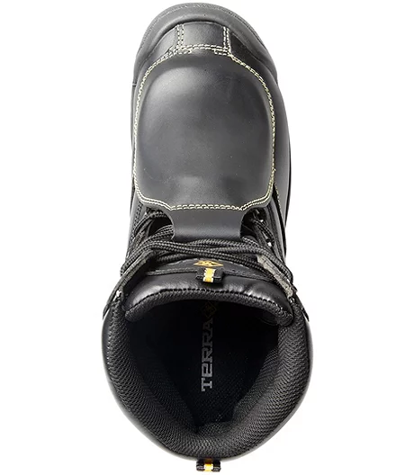 The 8″ Terra® Barricade external Met guard safety boot features superior strength and top of the foot safety. Skillfully designed from the ground up with a high-traction, anti-F.O.D slip-resistant rubber outsole and a direct- injected, shock absorbing PU midsole. The innovative external-moulded fibreglass metatarsal guard (with KEVLAR® stitching for added safety) protects feet in heavy duty work environments. Temperature and odour control are addressed with CLEANFEET®, 220g of Thinsulateâ„¢, and the full-grain waterproof sealed-seam leather upper. Also available in 6″.