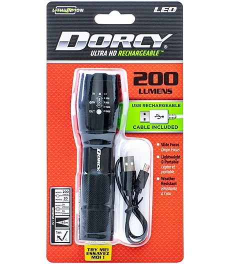 Lightweight and portable, this Dorcy flashlight makes a practical addition to your sporting and hobby arsenal. The weather-resistant torch projects a long beam with 200 lumens of power. It can be recharged using the included USB cable.