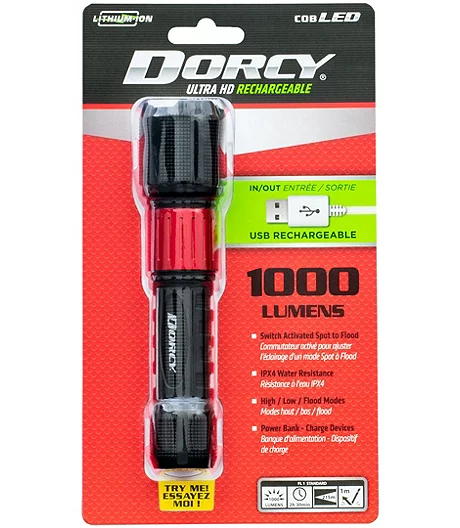 Light your way with this high-powered Dorcy flashlight offering 1000 lumens. It provides multiple light output modes and it can be recharged using a USB connector.
