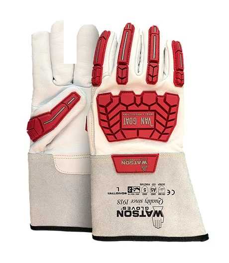 Full sock Cutshield™ Paramid/steel/polyester liner for superior protection, ANSI A5. Hard-wearing full-grain goatskin leather offers exceptional strength and dexterity. Heavy duty rubber on back of hand, fingers and wrist provides impact protection. Classic gunn cut with wing thumb has seams set away from working area of fingers for a comfortable fit. Stitched with Kevlar thread provides strength and durability. Gauntlet style cuff for additional wrist and forearm protection.