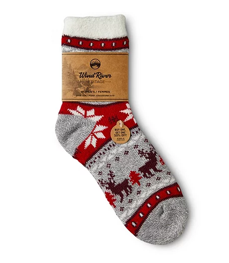 A knitted reindeer pattern highlights these double-knit socks from our WindRiver Heritage Collection. The supersoft lining makes these socks warm and cozy.