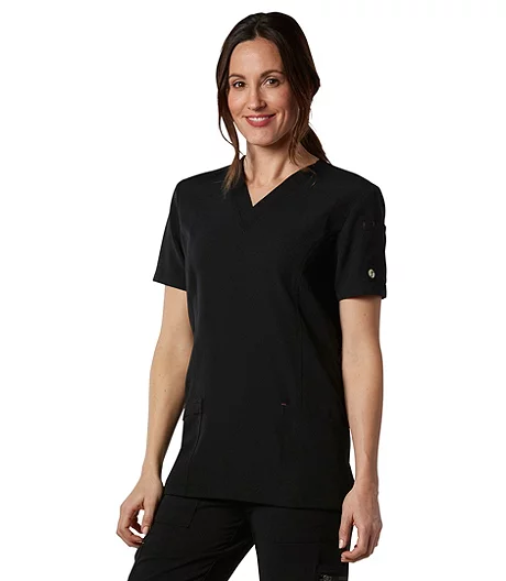 This Health Pro scrub top features four-way stretch that allows easy mobility. The V-neck top features topstitching details on the side panels. Two front pockets and a zippered sleeve pocket provide room for your small workday essentials.