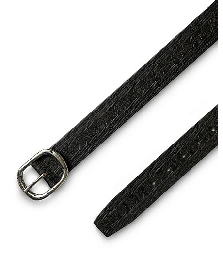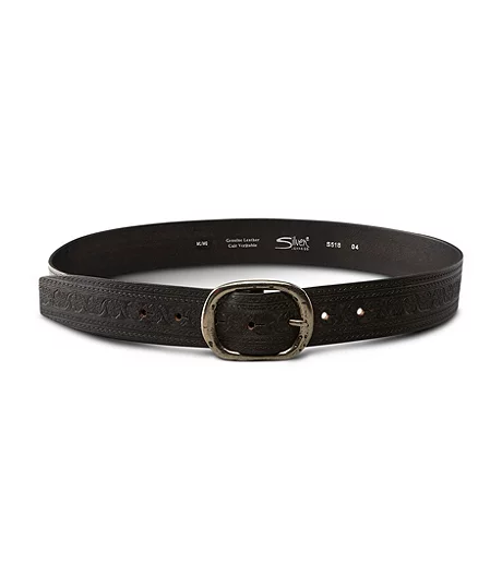 From Silver Jeans, this heavyweight leather belt is embossed with a Marrakesh-inspired pattern. It has a frame and prong buckle with a hammered antique nickel finish. The perfect complement for your Silver jeans.
